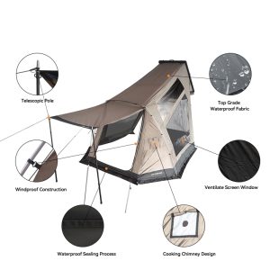 Su diseño con bisagras en X permite un armado rápido y estable, mientras que las ventanas, puerta y claraboya ofrecen luz natural y vistas panorámicas durante el viaje.