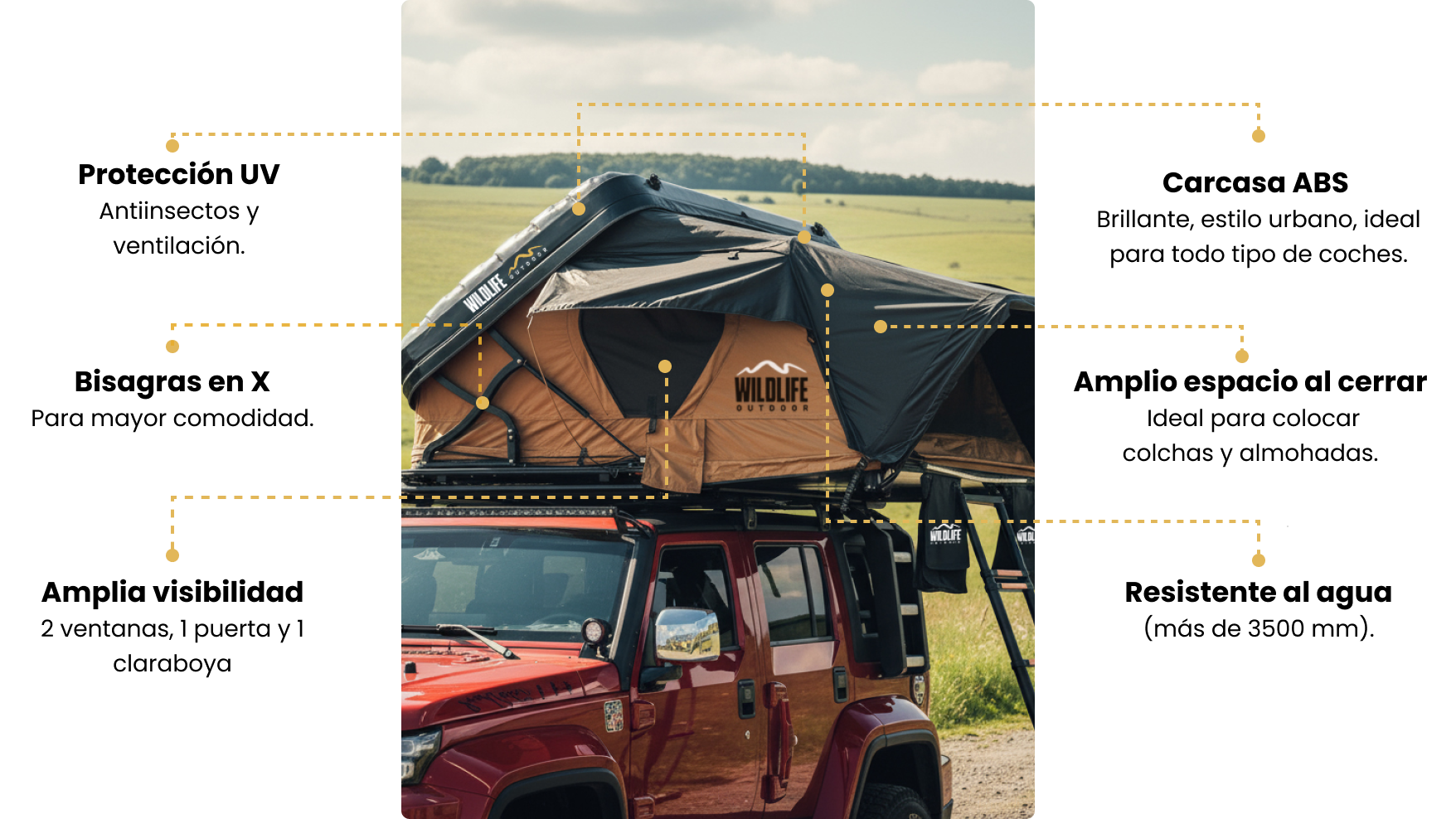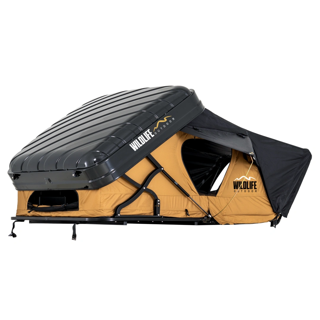 Esta carpa ofrece espacio y confort en tus aventuras al aire libre. Su carcasa ABS brillante de estilo urbano es resistente y práctica, con amplio espacio al cerrarse para guardar colchas y almohadas. El sistema de bisagras en X facilita un armado rápido y seguro, mientras que el colchón memory foam de 6 cm garantiza un descanso cómodo. Cuenta con dos barras de luz LED fría, excelente ventilación, protección UV y resistencia al agua superior a 3500 mm, ideal para las 4 estaciones del año. Sus ventanas, puerta y claraboya proporcionan luz natural y visibilidad panorámica, y la escalera de 2,3 m, junto con bolsas para zapatos y compartimentos de almacenamiento, hacen que cada viaje sea más organizado y cómodo.